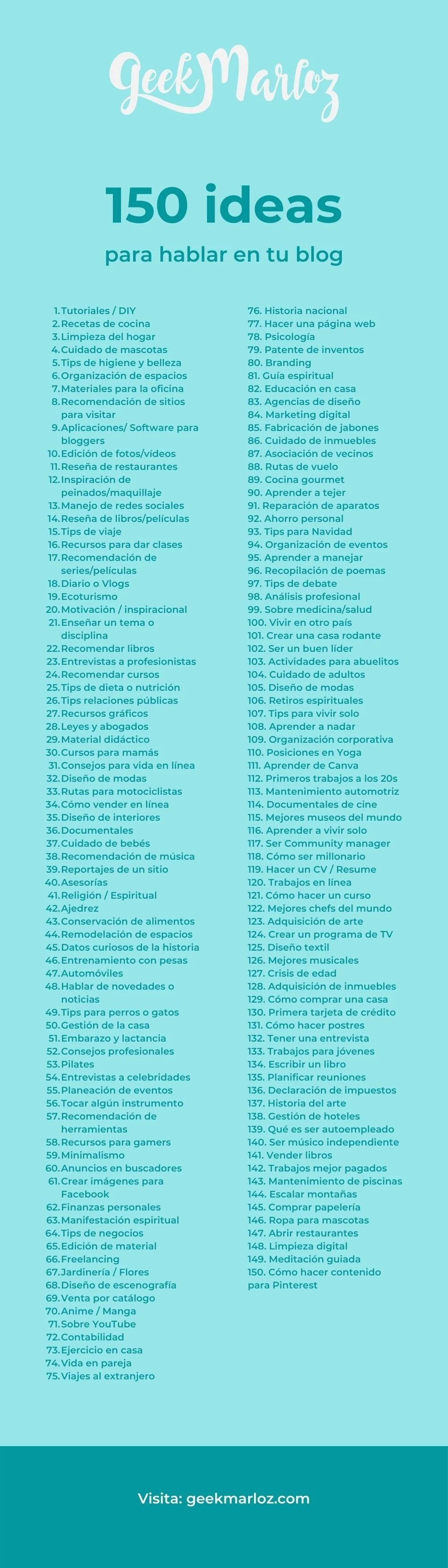 Cuando empiezas en el bello mundo de los blogs, es muy probable que te sientas abrumado y no sepas por dónde empezar. Quizás tienes muchas ganas de escribir sobre un tema en específico pero no sabes desde dónde empezar a abordarlo, o quizás sólo quieres escribir y escribir pero todavía no tienes un tema. No te preocupes, vengo al rescate. Hoy te comparto 150 opciones para escribir contenido en tu blog.